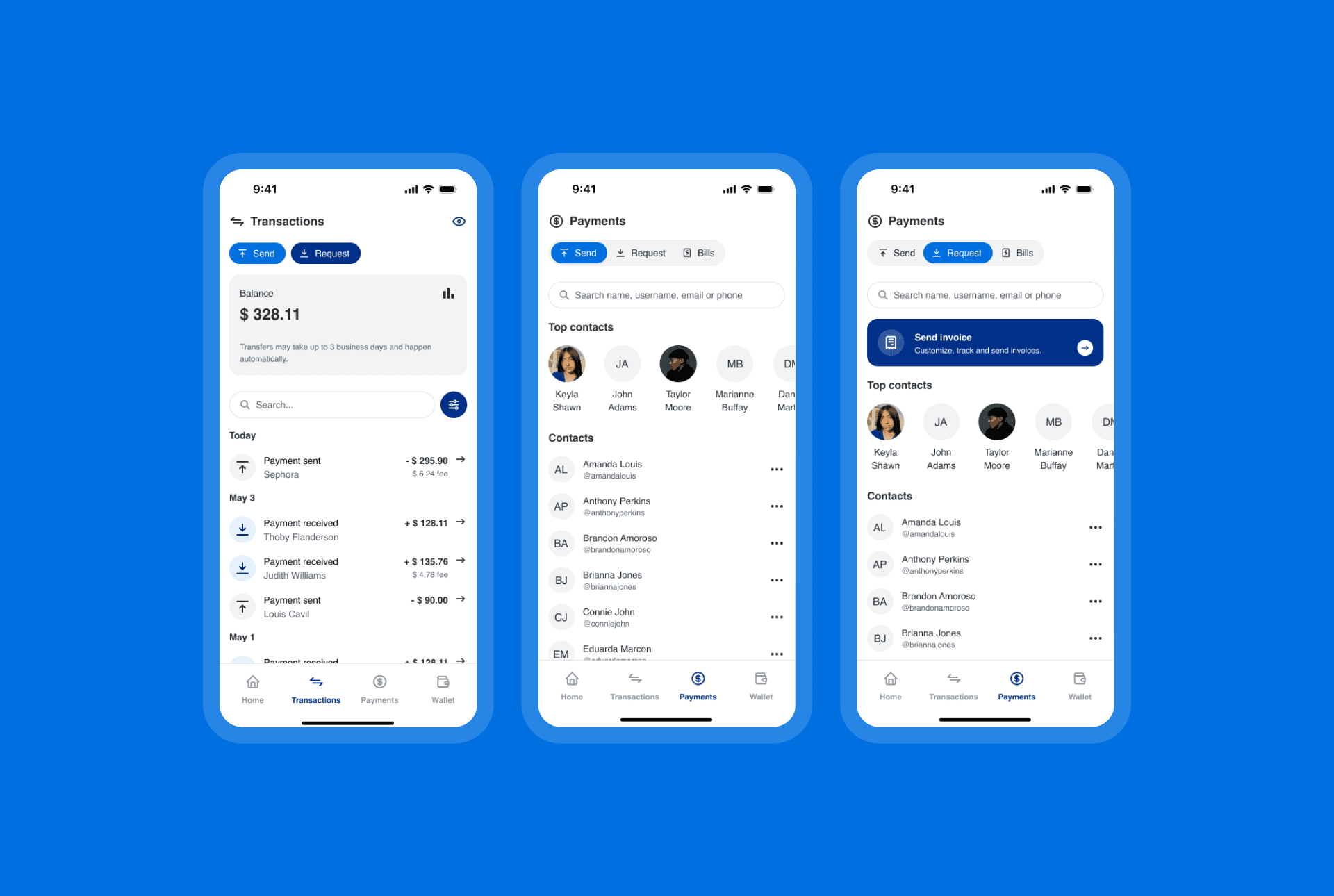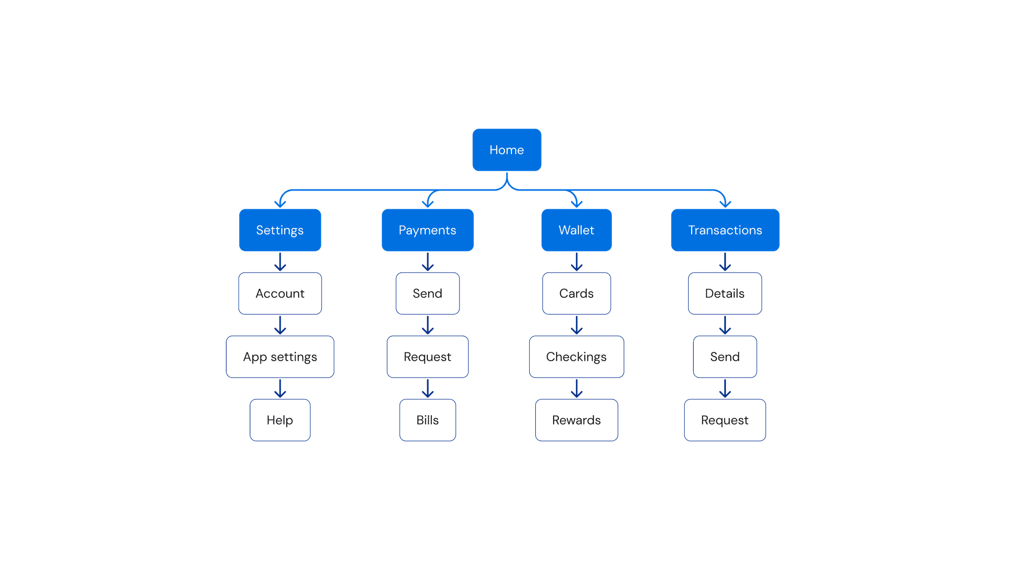 Para simplificar a navegação, as Transações foram movidas da Carteira para o menu principal, refletindo sua importância para os usuários. As ações Enviar e Solicitar também foram tornadas mais acessíveis na Página Inicial, Pagamentos e Transações. As opções de menu foram reestruturadas para fornecer acesso mais rápido a recursos de ajuda, configurações de conta e preferências do aplicativo, reduzindo a fricção e melhorando a eficiência geral.